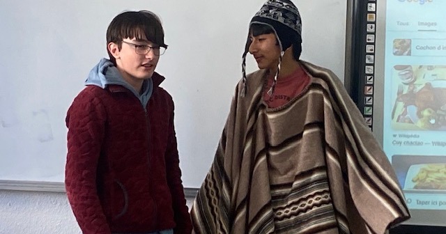 Au fil de ses interventions, Luciano a partagé des aspects essentiels de sa culture : traditions, artisanat, cuisine… Les élèves ont pu découvrir et manipuler des étoffes en laine d’alpaga et de vigogne, des objets symboliques, ainsi que les célèbres poncho et chullo, portés pour l’occasion.